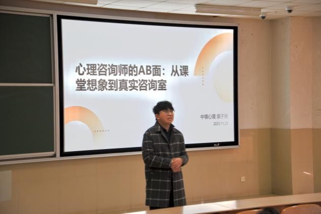 分享会上,袁子腾以“过来人”的真诚视角,深度拆解心理咨询师的“AB面”。他既生动讲述了陪伴来访者解开心结、重获心灵力量的温暖成就感,也直面行业真实挑战——坦诚分享面对阻抗案例时的挫败感与自我调适方法,打破了“心理咨询师能轻松治愈他人”的理想化滤镜。针对在场学生最关心的职业准备问题,他给出具体建议:大学阶段需扎实掌握《普通心理学》《咨询心理学》等核心课程知识,同时注重培养“自我关怀”素养与共情能力。现场互动环节中,袁子腾还结合真实案例演示实用咨询话术,并通过“咨询师真实一天”情景模拟,带同学们直观了解从个案梳理、咨询实操到督导复盘的完整工作流程。