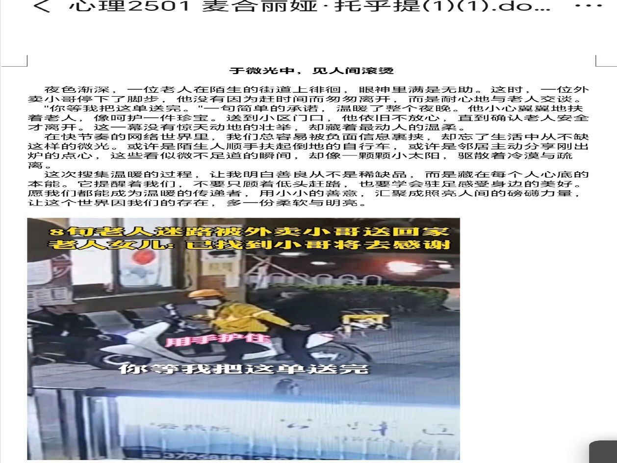 活动中,同学们搜集并截图保存触动心灵的新闻瞬间,再以真挚文字撰写个人感悟。征集期间,大量饱含温度的作品涌来:从路人自发帮忙捡拾洒落的玉米,到社区为外卖员特设暖心厨房;从街头陌生人的举手相助,到基层工作者的默默坚守,同学们发掘的故事覆盖社会生活方方面面,每一张截图都是人性光辉的生动定格,每一段感悟都是青年视角的深刻共鸣。“寒风再烈,也抵不过人心的滚烫”“秋冬的寒凉或许无法避免,但人与人之间的善意与关怀,总能汇聚成驱散寒意的暖流”——这些直白又真挚的话语,是同学们对社会温情的细腻解读。