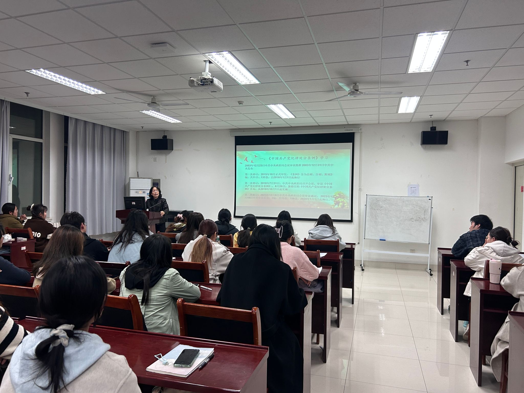 张宝华以“学习《中国共产党纪律处分条例》”为主题,结合近年来全面从严治党典型案例,深入剖析反腐败斗争的长效机制。她强调,同学们要从思想源头抵制诱惑,严守廉洁底线,将纪律意识内化为行为准则。