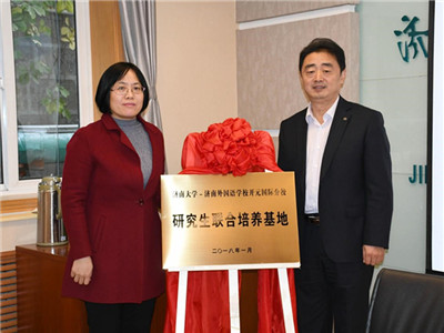 揭牌仪式上,济南大学研究生院副院长郝晓艳对联合培养基地的落成表示了祝贺,对在基地建立过程中给与关注和支持的相关领导和老师表达了感谢, 并介绍了济南大学研究生教育的基本理念和培养方式,肯定了济南外国语学校开元国际分校的师资团队力量。她指出,校外实习基地在研究生人才培养过程中具有重要作用,高校与培养基地联合的培养方式是有利于学生、高校和实习基地不断创新与发展的三赢机制。希望我院以此基地的成立为契机,坚持知识、能力和素质三位一体的人才培养观念,不断创新联合培养模式,切实走出一条特色鲜明、成效显著的教师培养道路。