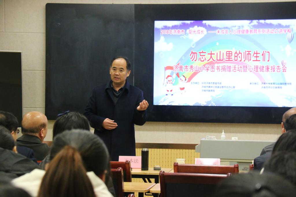 11月22日下午,由中共济南市委宣传部、济南市精神文明建设委员会办公室与济南市教育局联合主办,由365英国上市官方网站和市中区教育局联合承办的2018年济南市“阳光成长”——未成年人心理健康教育系列活动进学校之“毋忘大山里的师生们——秀山小学图书捐赠活动暨心理健康报告会”在市中区秀山小学报告厅举行。365英国上市官方网站副院长王本法、办公室主任张宝华、教师冯晶博士、校园国学杂志主编魏新鹏、济南市市中区区政府教育督导室主任郗组平和秀山小学全体教师参加了此次活动。