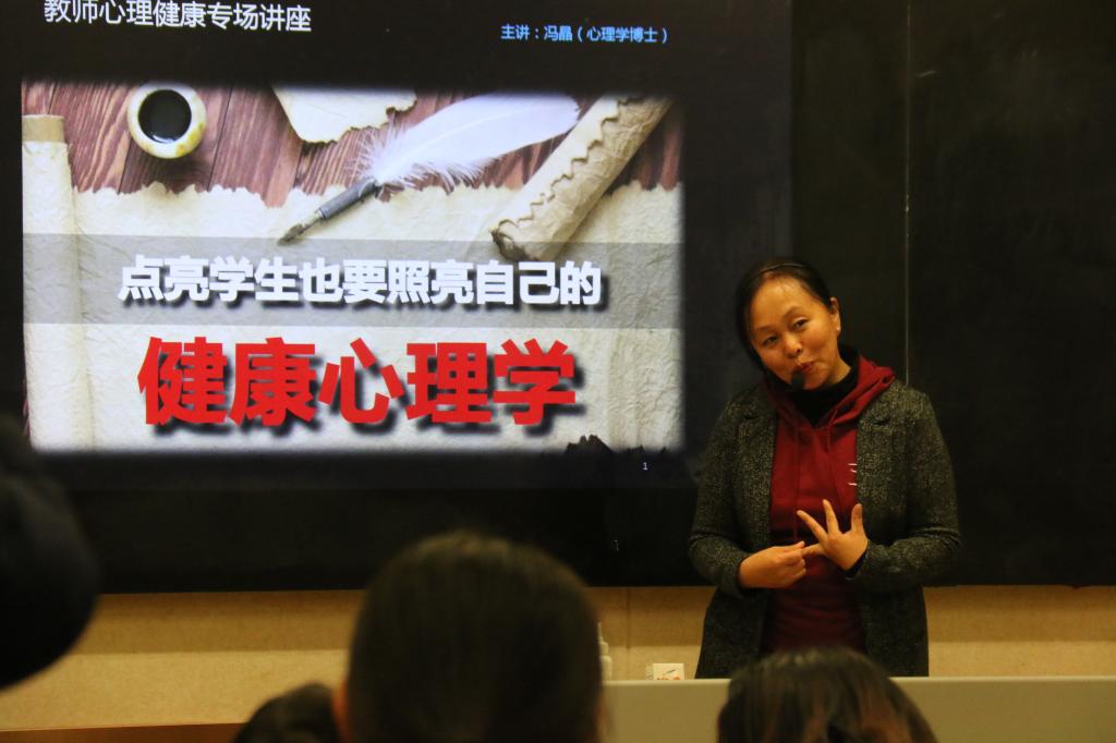 图书捐赠仪式结束后,冯晶博士做了题为“点亮学生也要照亮自己的健康心理学”。冯晶博士的报告从一个心理健康小测验开始,详细论述了压力应对、情绪管理、戒除网瘾、克服冷暴力以及小学教师如何结合教学工作开展科学研究等方面的知识,报告深入浅出,引人入胜,受到了与会老师的一致好评。