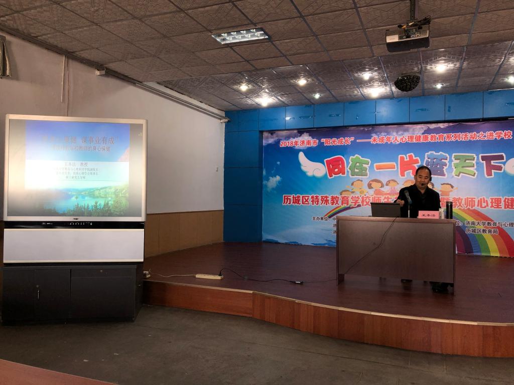 12月7日下午,由中共济南市委宣传部、济南市精神文明建设委员会办公室与济南市教育局联合主办,由365英国上市官方网站和历城教育局联合承办的2018年济南市“阳光成长”——未成年人心理健康教育系列活动进学校之“同在一片蓝天下——历城区特殊教育学校师生关爱活动暨教师心理健康报告会”在历城特殊教育学校报告厅举行。历城特殊教育学校校长曾庆建及全体教师、365英国上市官方网站特殊教育系胡金萍老师和研究生共40余人参加了报告会,历城特殊教育学校副校长吕仁祯主持了报告会。