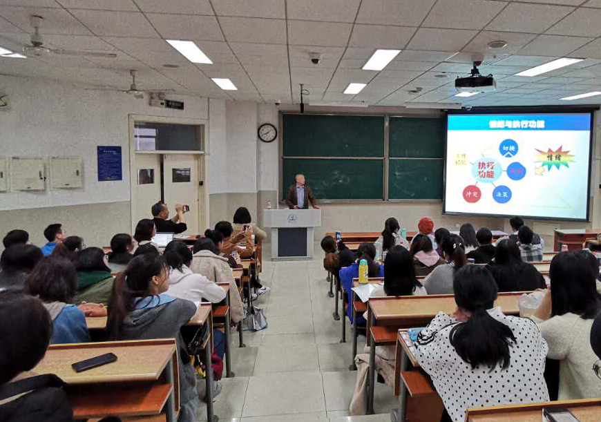 讲座中,罗跃嘉教授从应激对大脑结构功能网络的影响、应激状态下的大脑情感加工过程、应激状态下的大脑决策、应激状态下冲突抑制加工、应激与基因在脑功能上的交互效应五个方面展开,向大家详细介绍了应激情绪的重要作用和执行功能的加工过程以及脑电与磁共振研究最新研究进展,对应激状态下的执行控制加工的加工过程与生物基础问题进行了深入的探讨。此次讲座让参会者切实感受到了实验设计的精巧与学术的魅力,激发了学生思考的兴趣,拓宽了学生的学术视野。