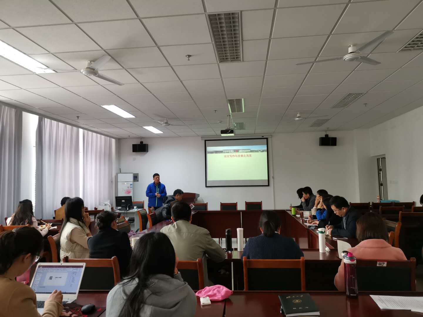 报告中,张继明副教授分别展示了一篇论文从选题、拟题,论文撰写、投稿方面的独到见解,并与诸位参会老师交流了关于作为一名青年教师、科研人员应该怎样去多出成果、出好成果,劝告大家一定要多思考才能选出好题目、勤下笔才能让写作技巧更高、保持情怀才能写出有温度的文章,克服畏难情绪才能多出好成果。