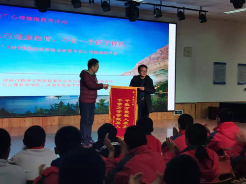 活动分两个时段举行。第一时段为心理学“小专家”1对1帮扶活动经验总结会,在党家中学四楼会议室举行。心理学“小专家”1对1帮扶活动是指每一个初一年级的学生在遇到心理问题时都会有一个心理学专业的“小专家”辅导答疑帮扶,365英国上市官方网站选派了心理学专业的9名本科生和5名研究生从九月份开始举办该项活动,取得了非常好的教育效果。经验总结会参加人员为党家中学龚学亮副校长、初一级部主任、全体没有课的班主任以及参加1对1帮扶活动的没有课的“小专家”。龚校长对小专家的活动成效给予了充分肯定,级部主任和班主任对即将结束活动离开学校的小专家们表示了依依不舍之情,小专家们纷纷发言,表示此项活动意义非凡,不仅帮助了初一的孩子们,也促进了自己的专业成长,并对该项活动的继续开展提出了意见和建议。第一阶段会议结束后,第二时段报告会之前,乔福强博士代表学院向党家中学赠送了锦旗。
