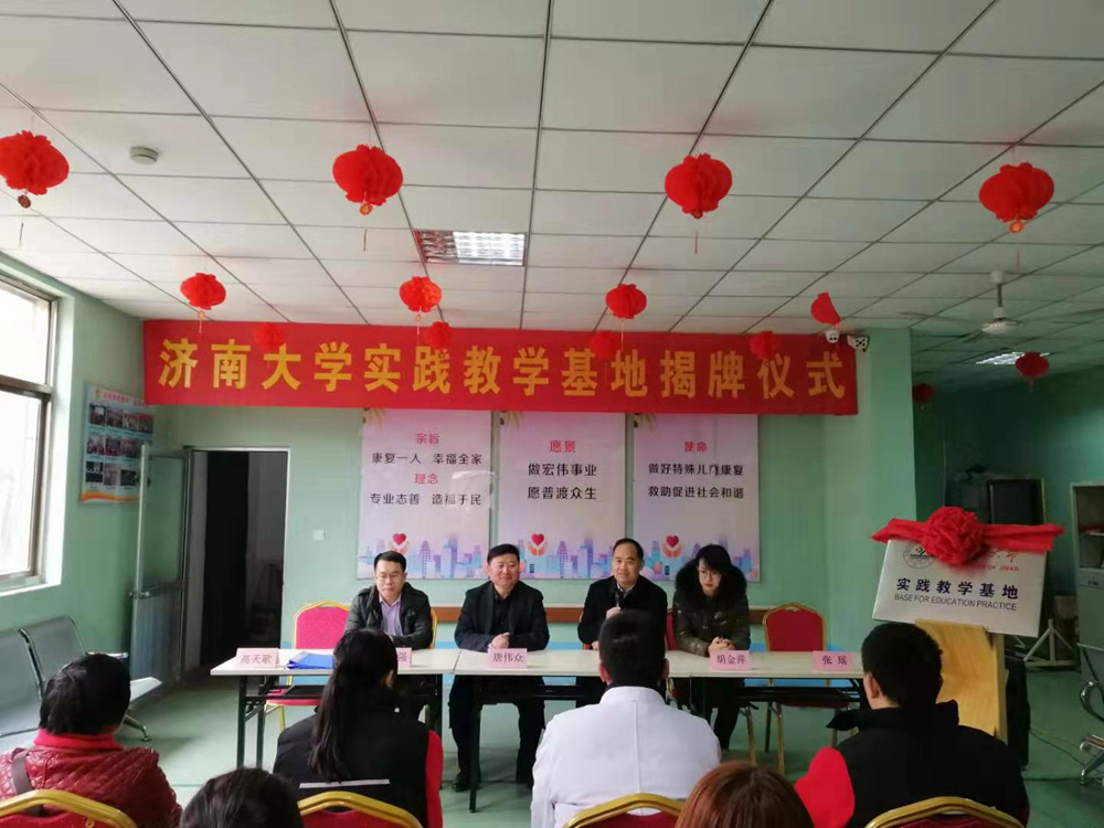 1月13日上午,365英国上市官方网站王本法教授、心理系主任乔福强博士、特殊教育系教师代表胡金萍老师和硕士研究生张瑶、高天歌一行,来到济南市市中区伟众儿童康复中心(以下简称“康复中心”),开展“济南大学实践基地挂牌仪式”活动。康复中心负责人唐伟众院长和各位领导、教师20余人参加此次活动。此次活动由伟众儿童康复中心教师主持。