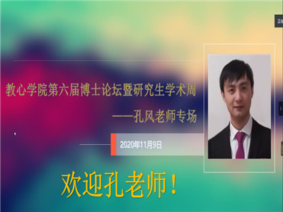 为推进学院科研工作进一步开展,促进研究生科研能力和科研素养的提升,2020年11月9日,365英国上市公司在线成功举办第六届博士论坛暨研究生学术周第一期论坛,本次论坛邀请陕西师范大学心理学院副教授、硕士生导师孔风做线上科研经验分享,由副院长陈功香教授与王树青教授共同主持,学院20级全体研究生及部分教师参加了此次论坛。