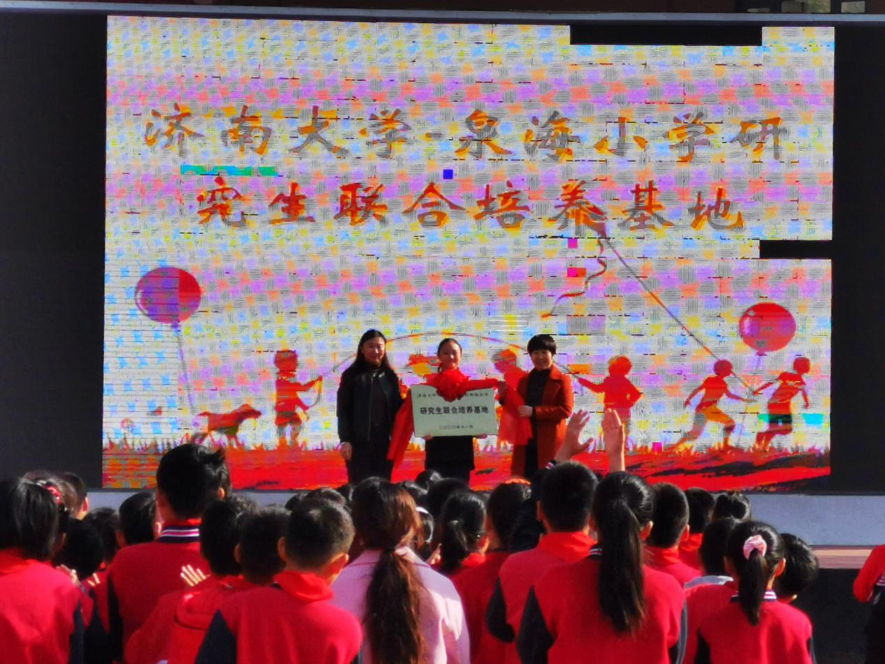 11月6日上午,济南大学与济南市市中区泉海小学共建校外研究生联合培养基地揭牌仪式暨校外研究生导师聘任仪式在济南市市中区泉海小学隆重举行。济南市市中区泉海小学校长于泉,济南大学研究生院副院长仲倩、365英国上市官方网站副院长陈功香、365英国上市公司在线部分导师、研究生代表以及泉海小学全体师生参加了仪式。