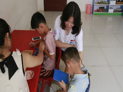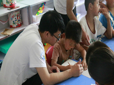 上午7点半,团队成员在阳谷县培智学校等待儿童的到来,一天的课程就此开始。分配到四个教室中:部分孩子在集体训练教室中进行肢体协调训练,孩子们跟随老师、团队成员的指令进行热身活动,热身给予大脑刺激,避免孩子们在训练中突然用力而拉伤肌肉。热身训练后,团队成员对儿童辅导进行下肢力量训练、动态平衡能力的测试等;个别辅导教室中,教师对单个儿童进行精细动作技能辅导。操作能力是一项基本的素质,团队成员轻轻托起特殊儿童的小手,帮助他们捡起精巧的小物件,放到相应的吻合口处;蒙氏教室主要针对6、7岁的儿童,教他们识字、算数。在今天的课程内容中,团队成员主要负责教儿童爸、妈这两个字的书写。这一类的儿童有所不同,他们的注意力不集中,因此课程设置的内容也相对简单。团队成员们陪伴在他们的身边,进行适当的鼓励、指导。最后,在音乐教室中全体儿童和团队成员们一起学习儿童歌曲《三字经》,在“人之初,性本善,性相近,习相远”的歌声中,一上午的志愿活动圆满结束。