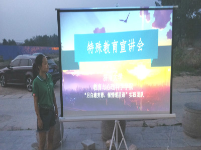 晚上8点,实践团成员们来到紫石街广场布置活动场地。晚上的紫石街广场已渐渐聚集了一些乘凉的市民和孩子,为了预热场地,成员们先对他们进行了简单的询问,如“您对特殊儿童是否了解?”、“如果发现家中有特殊儿童,您会怎样对其教育?”等问题。简短的调查发现,阳谷紫石街的市民们对特殊儿童有一定的了解,但是对于如何教育、如何矫正特殊儿童行为等方面并不是很了解,借此实践团成员们调整了宣讲计划,将教育问题放在了首位。活动开始后,着重讲解如何培育特殊儿童的问题以及如何早期发现孩子是否有智力、行为障碍。市民们积极参与,向实践团成员们提问问题。最后,以播放相关电影,结束了此次宣讲活动。