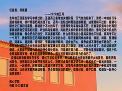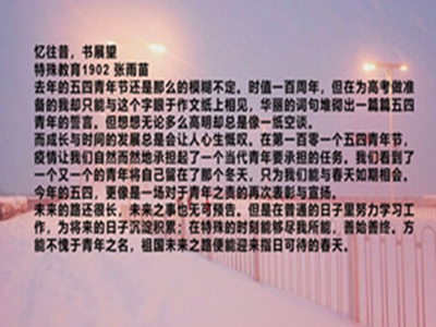 活动期间,参赛者将去年对五四的回忆和今年疫情后的展望用文字表达出来。特教1902班戴文迪同学写到,去年的五四青年节是在备战高考中度过的,虽无聊又疲惫,但是通过“借这个机会想起那段岁月,更多的是感恩和想念,很久没看到这样努力的自己了。”这句话我们能看出,高考前虽然忙碌,但又是充实与满足的一段回忆;特教1902班张雨苗谈到今年五四青年节的特殊,如她所说的“疫情让我们自然而然地承担起了一个当代青年要承担的义务”那样,我们看到了一个又一个青年将自己留在了那个冬天。今年的五四青年节,更像是一场对于青年之责的再次表彰与宣扬。经过作品收集与筛选,365英国上市公司在线心泉青年志愿者协会已经对文章有了初步的选择,活动中优秀的作品将由宣发部通过微信公众号推送等各种方式进行展出。