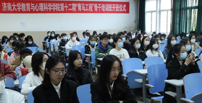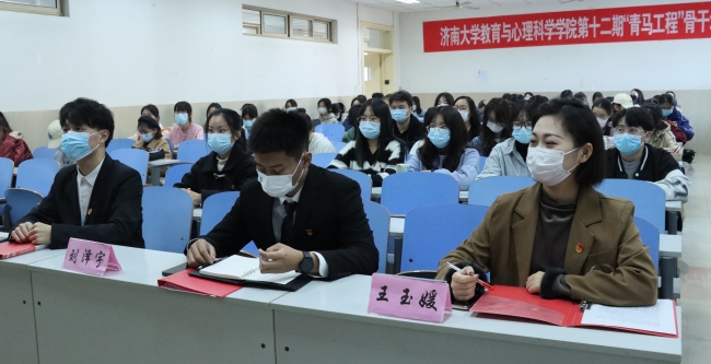 本次开班仪式包括重温入团誓词、专题学习、党史宣讲和学员代表发言等环节。在本期“青马班”学员赵亚萍领誓、全体学院重温入团誓词后,济南大学“青马工程”第十二期大学生骨干培训班第五团支部书记、信息科学与工程学院学生会主席团成员刘泽宇以“争做五个模范,践行五个带头”为主题进行领学。他表示,当代青年要下苦功夫、求真学问、练真本领,胸怀忧国忧民之心、爱国爱民之情,与真理常伴、和信仰同行;作为青马班学员,更应该带头学习马克思主义理论,坚持深入学、持久学、刻苦学、带着问题学、联系实际学,更高地把科学思想理论转化为认识世界、改造世界的强大物质力量。随后,济南大学“青马工程”第十二期大学生骨干培训班学员、水利与环境学院学生会主席团成员吴泓霖以“锤炼过硬本领,勇担时代使命”为主题进行领学。他结合党的二十大报告中习近平总书记对青年的殷切期望,呼吁全体“青马班”学员增强先锋意识,坚持守正创新,争做有志气、骨气和底气的新时代好青年。